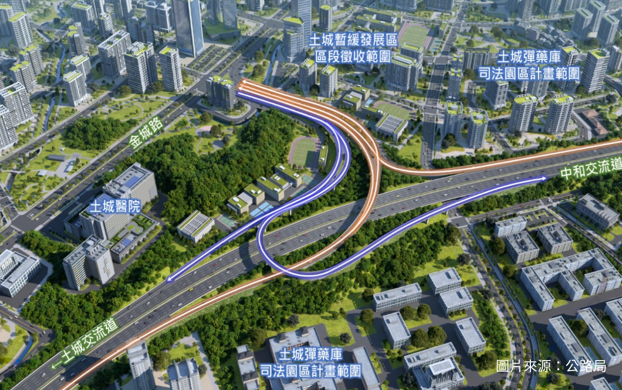以及正在進行的「土城司法園區」計畫,面積非常龐大,範圍不只涵蓋交流道西南側,還有東西側沿線土地,勢必帶來更多移入人口,因此可受惠於金城交流道的客群,絕對不只原本土城在地客,更是為了未來進行鋪路。金城交流道已於2023年10月開工,工程總經費約56.48萬,預計2027年底完工,通車後交通分流、縮短通勤時間,活絡區域經濟也可吸引更多企業進駐,推升土城房產價值。