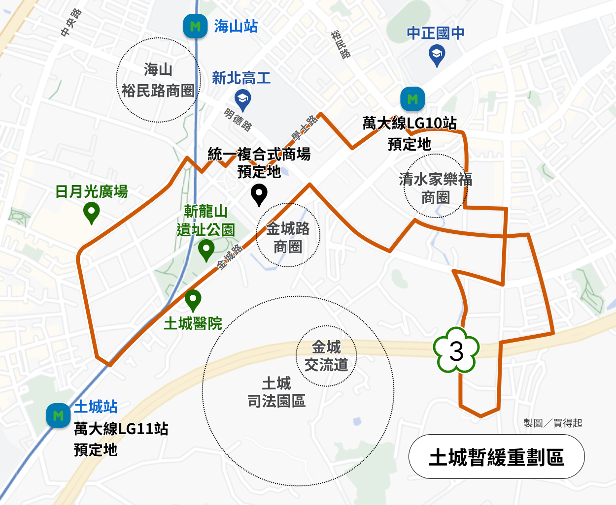 土城暫緩重劃區:擁有許多成熟商圈,裕民路小吃、清水家樂福商圈、金城路上大型連鎖店、日月光廣場結合休閒娛樂、影城、餐飲的購物商場;此外,區域內還擁有新北市立土城長庚醫院、面積約2.9公頃的斬龍山遺址公園。以上總總規劃,該有的機能都沒少,生活小吃、公園綠地、百貨商場、醫療資源,稱得上是有完整生活機能的重劃區