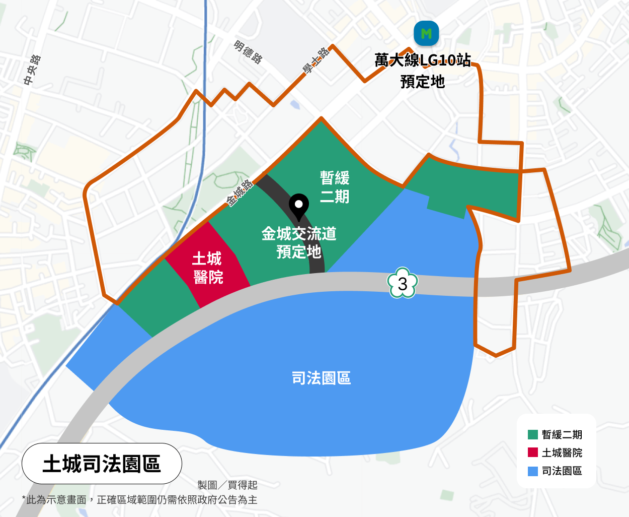 這裡重點可拆成兩塊來看,「司法園區+暫緩重劃區二期」。司法園區開發,原為新北地方法院、地檢署及看守所搬遷計畫所帶動,但這並不是單純的機關遷移,而是將「整個區域」給重新規劃,司法園區位在暫緩重劃區的南側,開發面積約30公頃,正好延續了暫緩重劃區的區域,且這片土地除了規劃機關用地之外,還釋出多塊商業區住宅區土地,這些土地的釋出,就是我們所謂的「暫緩重劃區二期」組成部分。