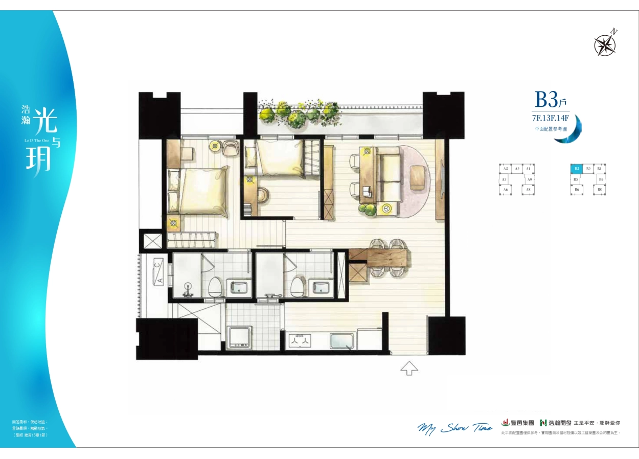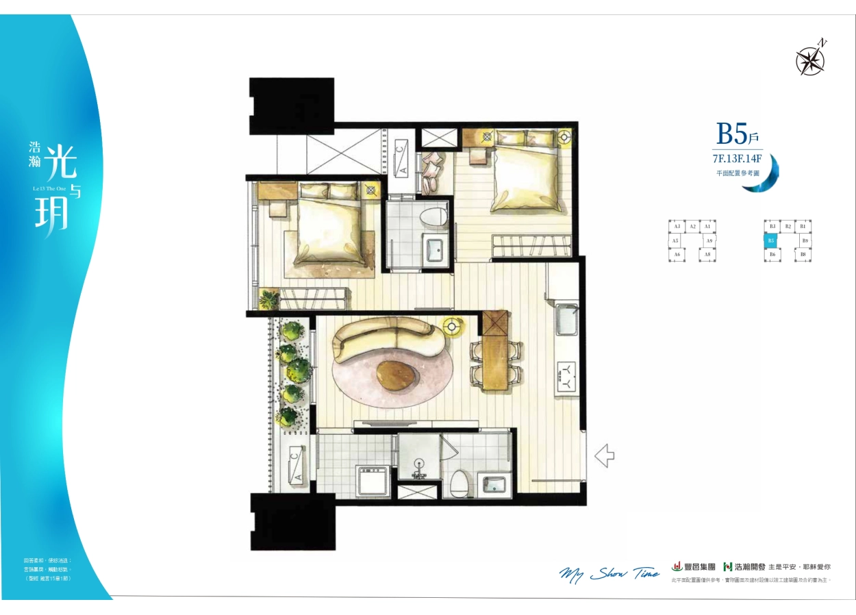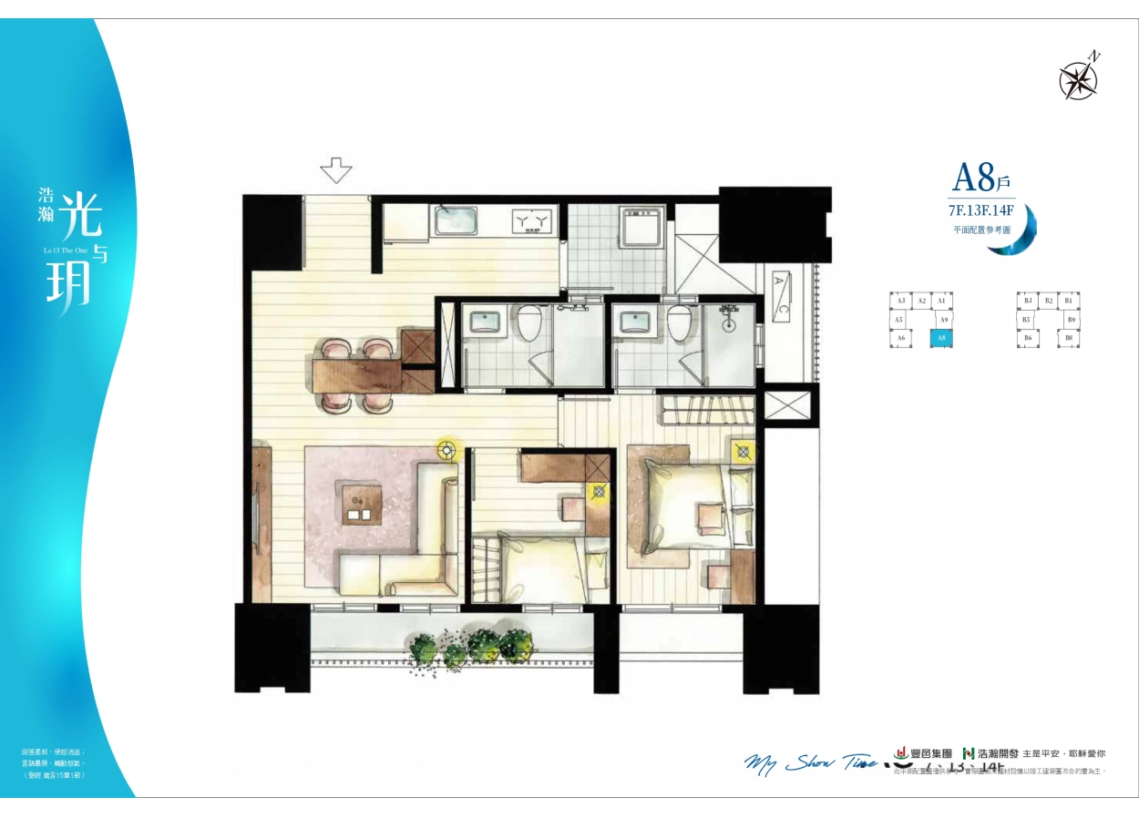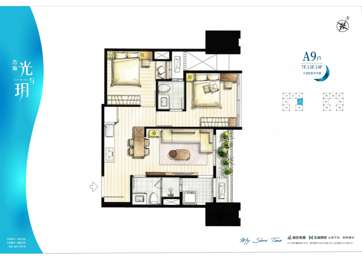 浩瀚光与玥主打均質兩房產品,有小孩的家庭可參考邊間2+1房戶別,空間大小會較合適,格局設計公私領域分明、雙面採光,客廳面寬近4米,是普遍三房以上尺度才會有的大面寬,後方可打造辦公空間,想培養才藝放架鋼琴也綽綽有餘,最加分的是兩間衛浴都開窗、冷氣室外機獨立擺放不佔用陽台空間,較爲可惜的是次臥空間略小,不過此案可客變根據自身需求調整。