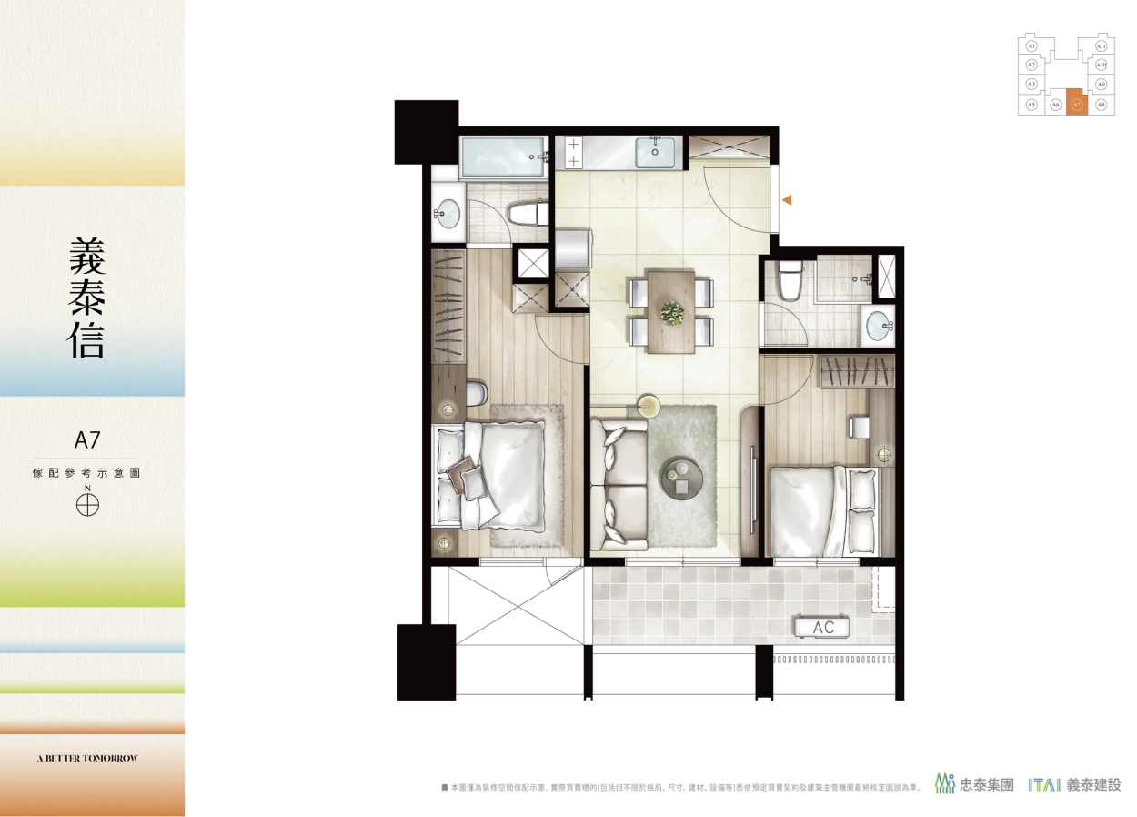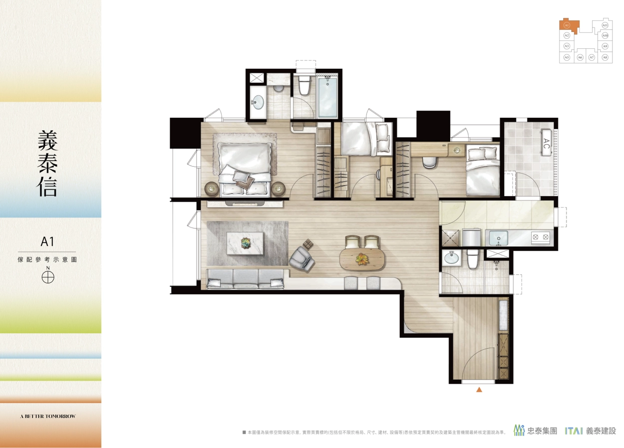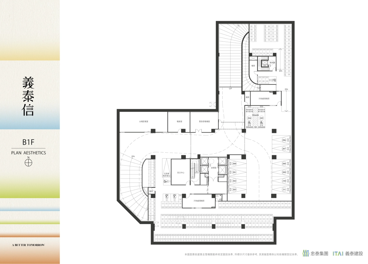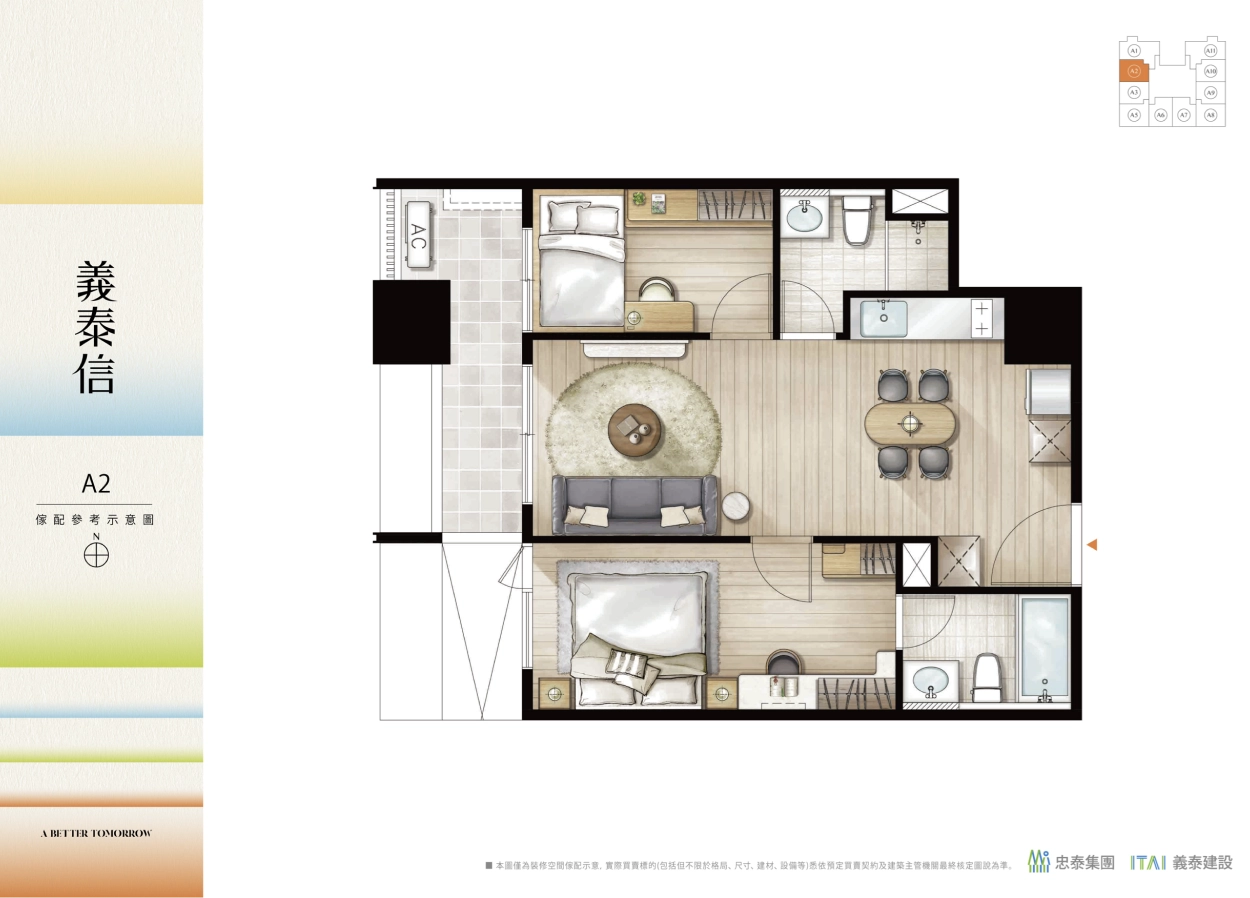 1樓規劃挑高接待大廳,公設主要在2樓,以實用設施為主,由忠泰集團御用的築內國際操刀,更由品牌旗下北歐櫥窗作為家具顧問,展顯建設品牌對質感美學的重視與追求。全案格局採對稱設計,邊間三房其餘為兩房配置,格局方正,明廳明房,動線流暢,舒適坪數規劃,樓高約3.4米,留有自住能住的舒心的好條件。
