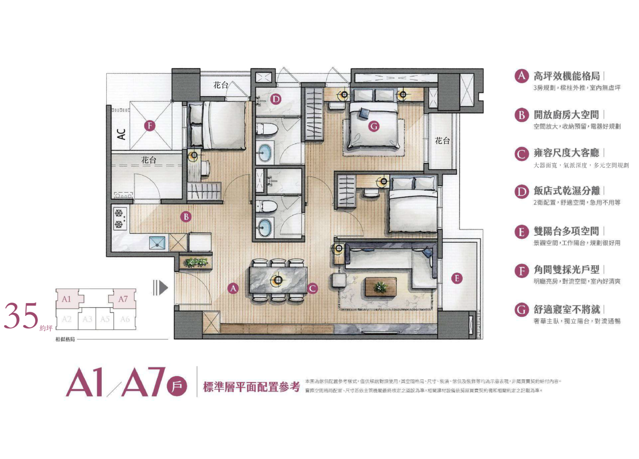 三房我個人最推薦A2/A6戶38.92坪,空間寬敞舒適,又不浪費,邊間雙面採光,樑柱外推,次臥空間皆可放下雙人床、衣櫃、書桌,玄關落塵區大小也符合我心中所想,不走長條型浪費;前陽台配置,可種植些花草,在家就能透氣,我特別注意到主臥擁有兩面窗戶,為罕見的角間雙採光房型,是少見的規劃,不只主臥空間明亮、室內對流通風佳。這樣格外突出特點,不經讓我想起世界南科A一期34坪,三房主臥也有著相當大尺度的空間、雙排衣櫃、大面開窗等,看得出建設公司在細節規劃與想法上,將自住客生活習慣、需求融入考量中,以自住客角度出發,能感受到格局的用心。