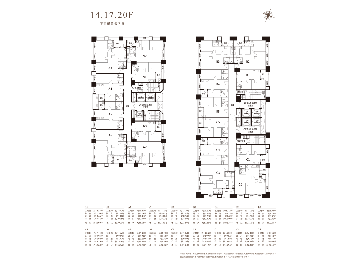 共有405戶,(404戶為住家、1戶為管委會),以兩房20-27坪、三房36-38坪多元規劃,A棟23樓一層八戶三梯、BC棟24樓一層各為五戶二梯。兩房一衛20-21坪產品為間接採光、無走道高坪效格局;兩房兩衛27-28坪採川字三分法,樑外推室內沒吃柱、空間彈性尺度大;三房兩衛36-38坪皆為邊間雙面採光格局,獨立式廚房動線順暢,樑柱外推,整體格局方正且空間坪效發揮良好。