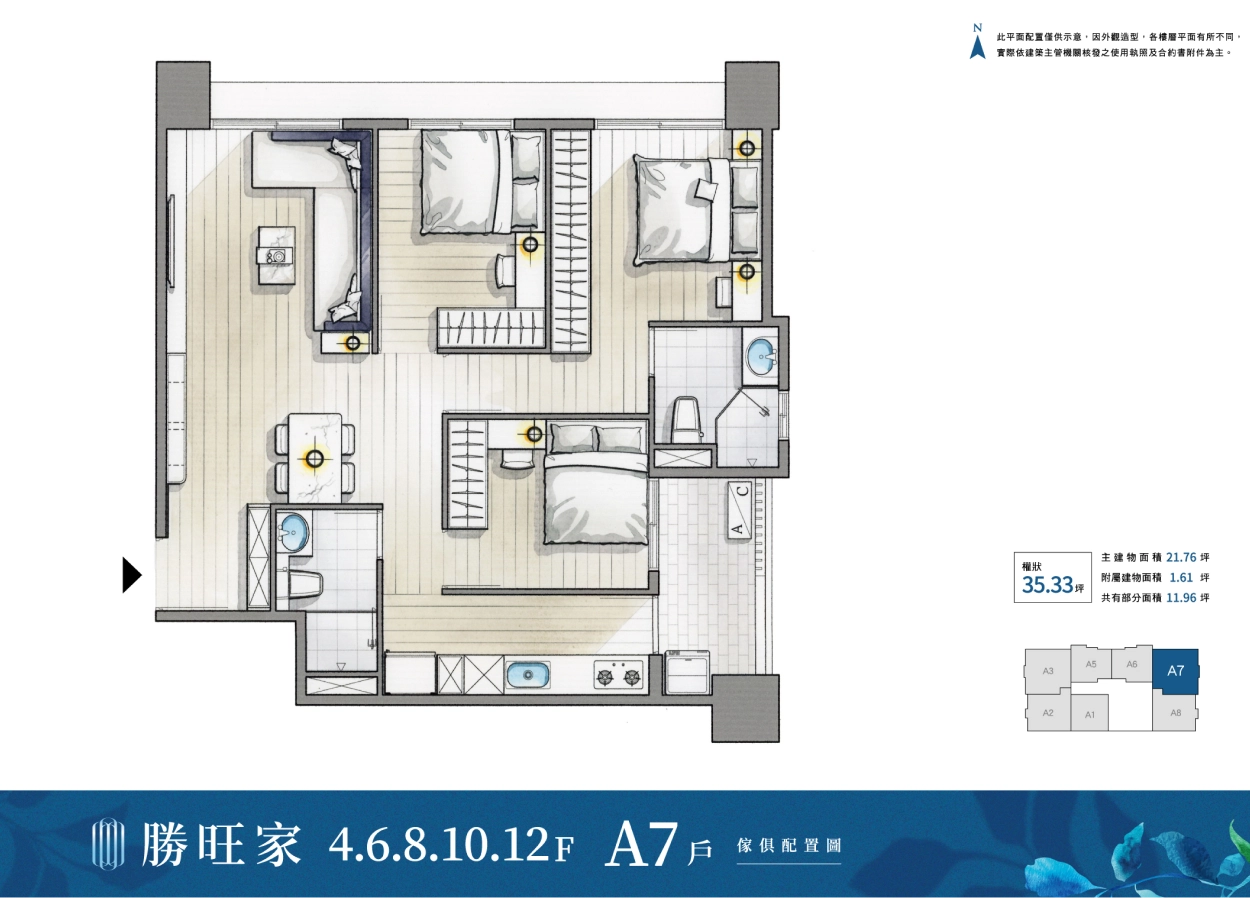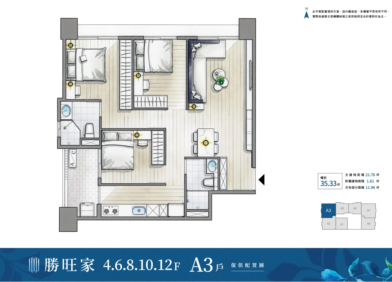 • A3、A5 35坪戶型需配雙車位,第二車有折扣,一車家庭戶別需做取捨。