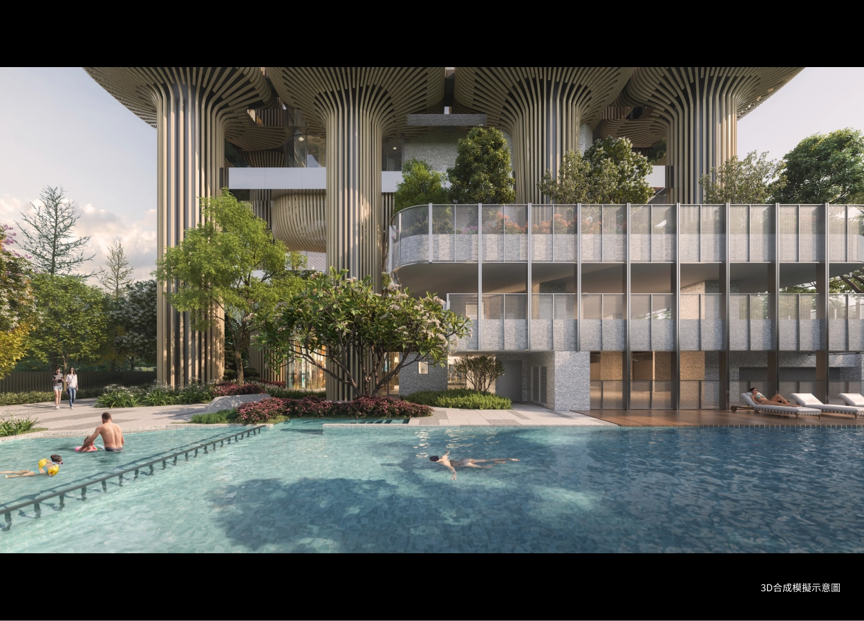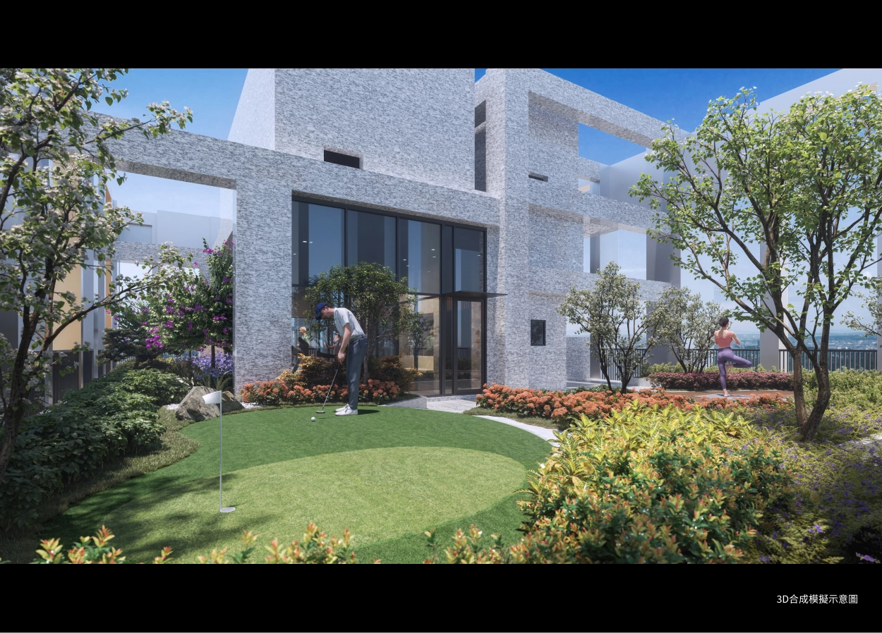在建築設計上,透過花朵基座與流暢曲線設計,打造亮眼浮島建築外觀,公設豐富多元,還有不少市面少見的特殊場域,像是泳池bar、戶外茶屋、露營區、BBQ區、Mini高爾夫區等。