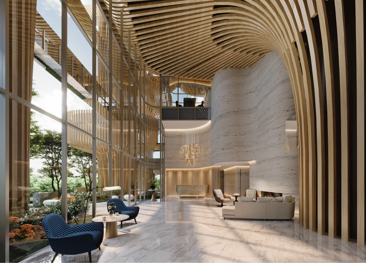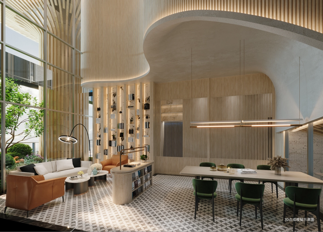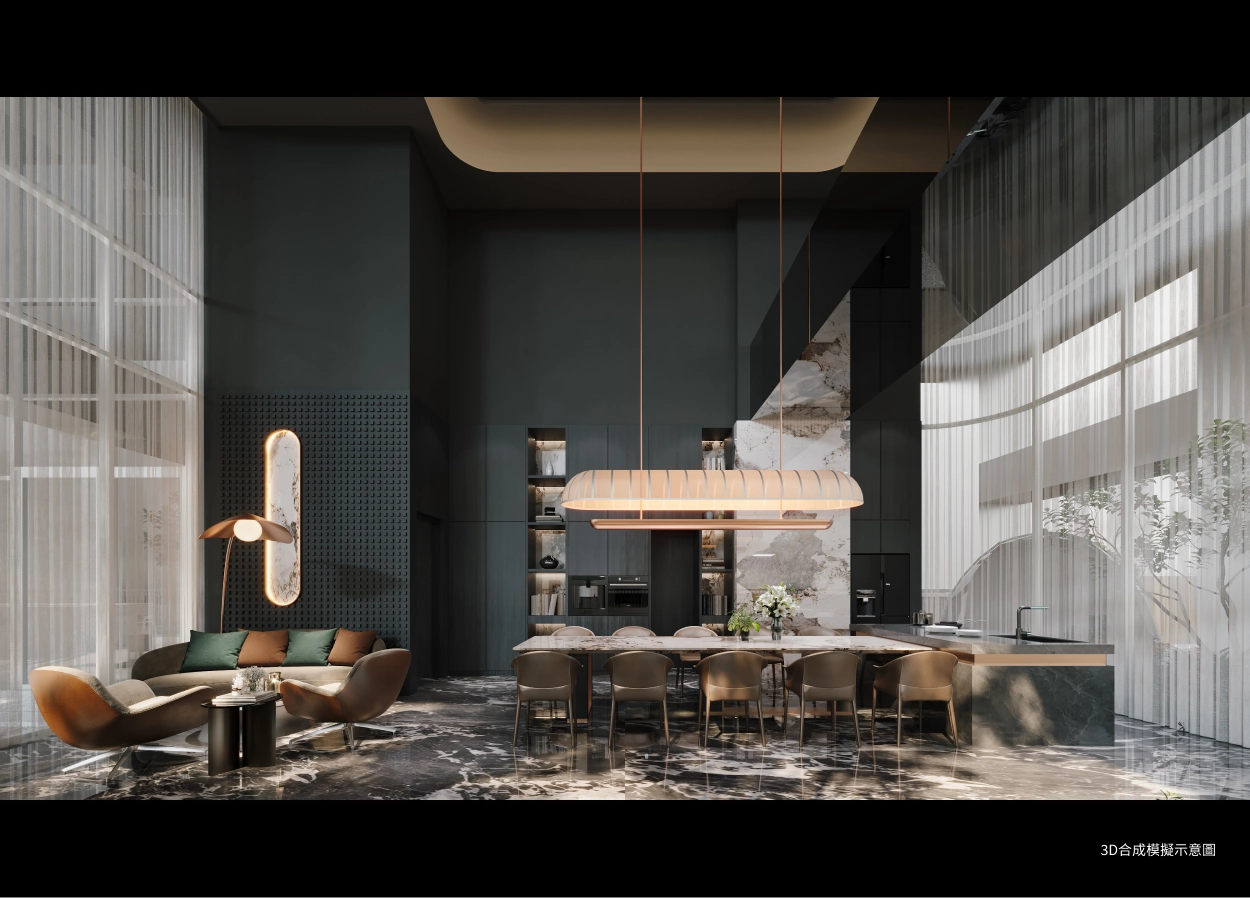 走進近10米高的接待大廳,宛如走進通透明亮的藝術畫廊,曲面弧形設計與大面玻璃落地窗巧妙融合,讓大樹意象的結構設計與自然光影映襯出別緻的空間體驗感,延伸戶外四季景觀植栽,日夜映照有截然不同的視覺和心靈享受,說是國際星級酒店一點也不為過,讓每次回家都充斥滿滿儀式感,更別說帶朋友來聚會,地標級的排場絕對夠有面子。