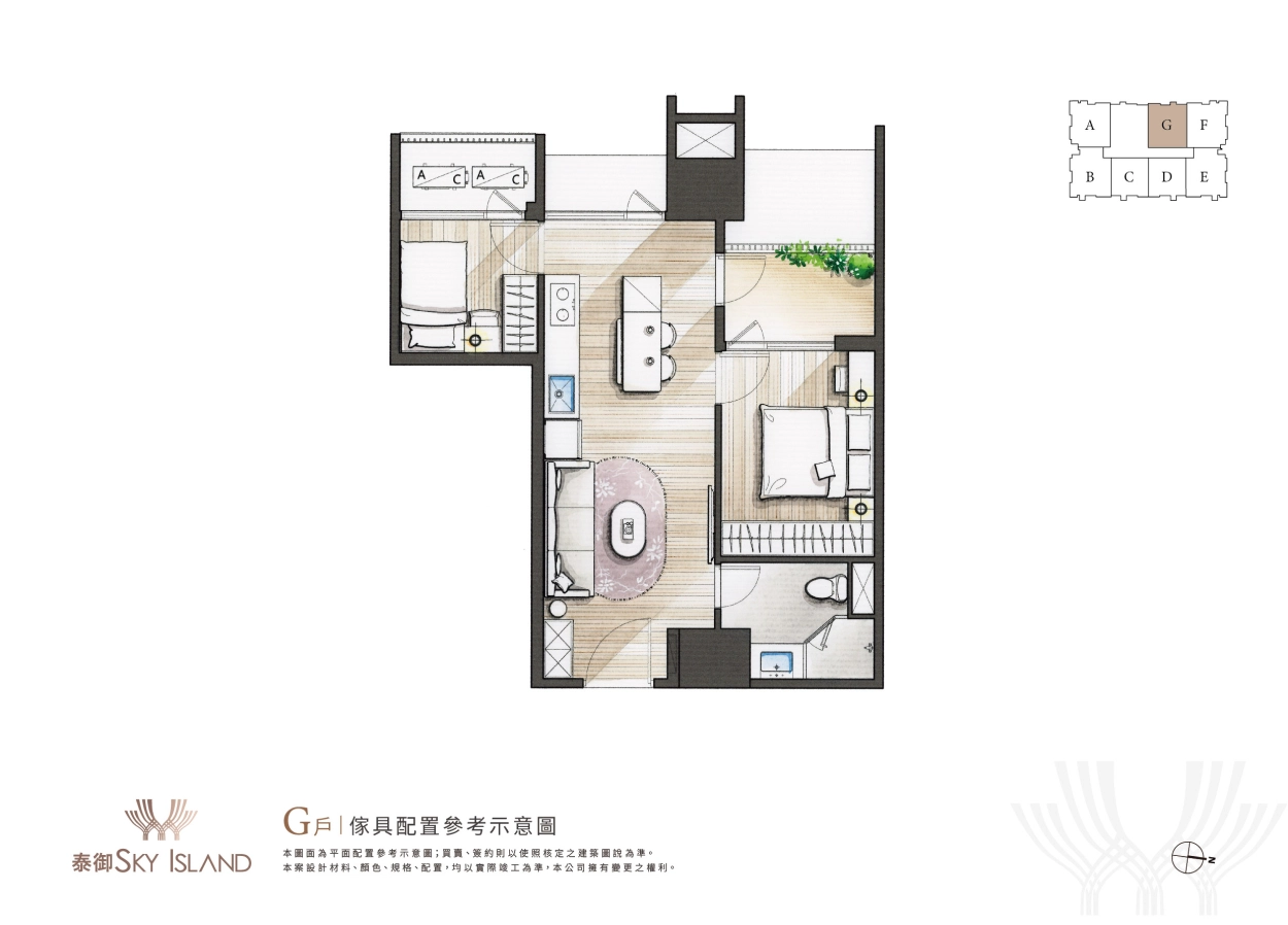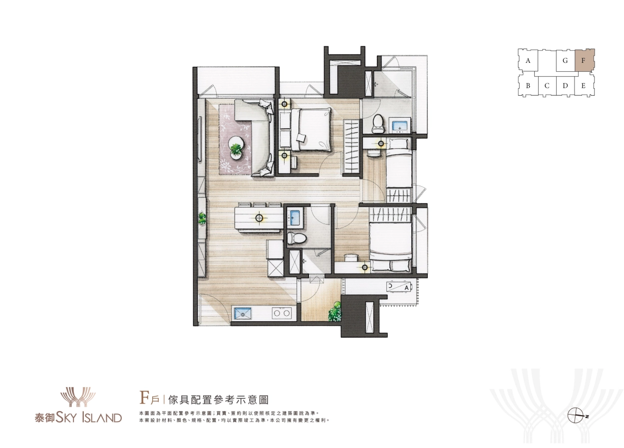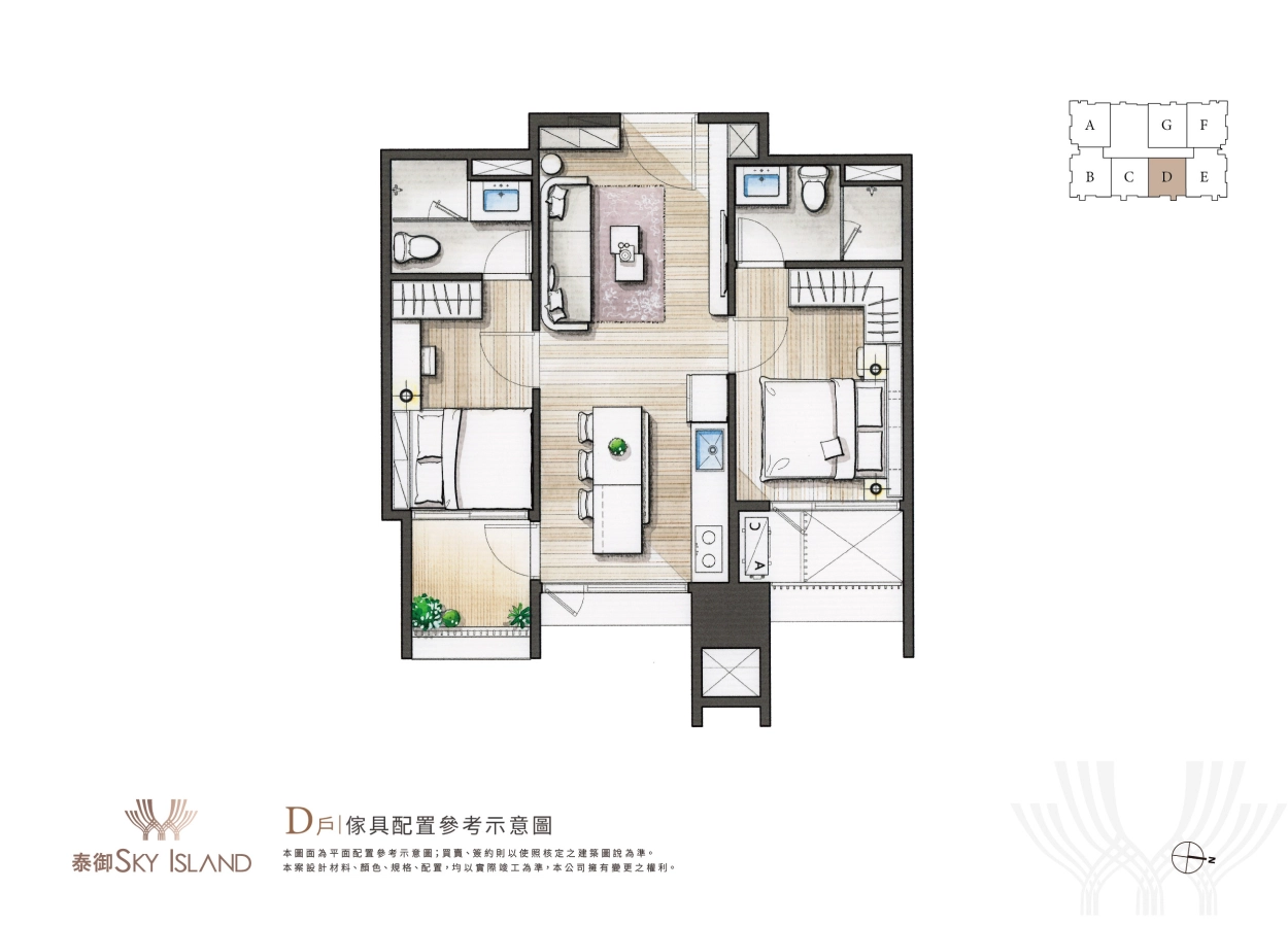 夢幻極具藝術設計的浮島建築外觀是一眼心動,而步入室內的設計裝潢當然也不能馬虎。泰御SKY ISLAND主打全室精裝入住,從天花板、地板、系統櫃、家具家電都精心規劃,更有不同風格設計可自由挑選,未來一卡皮箱就可直接輕鬆入住。(全室精裝詳細資訊可洽現場)