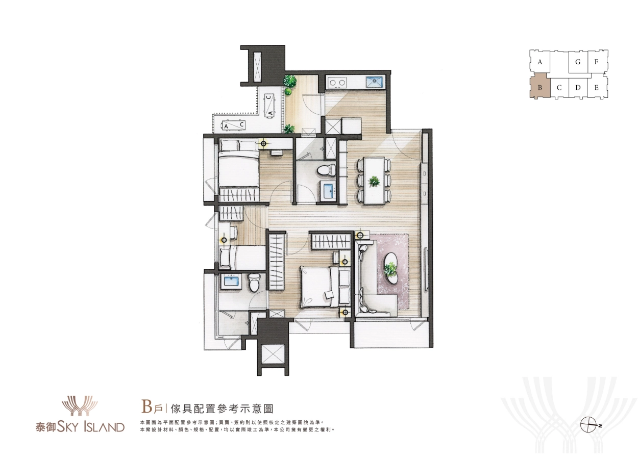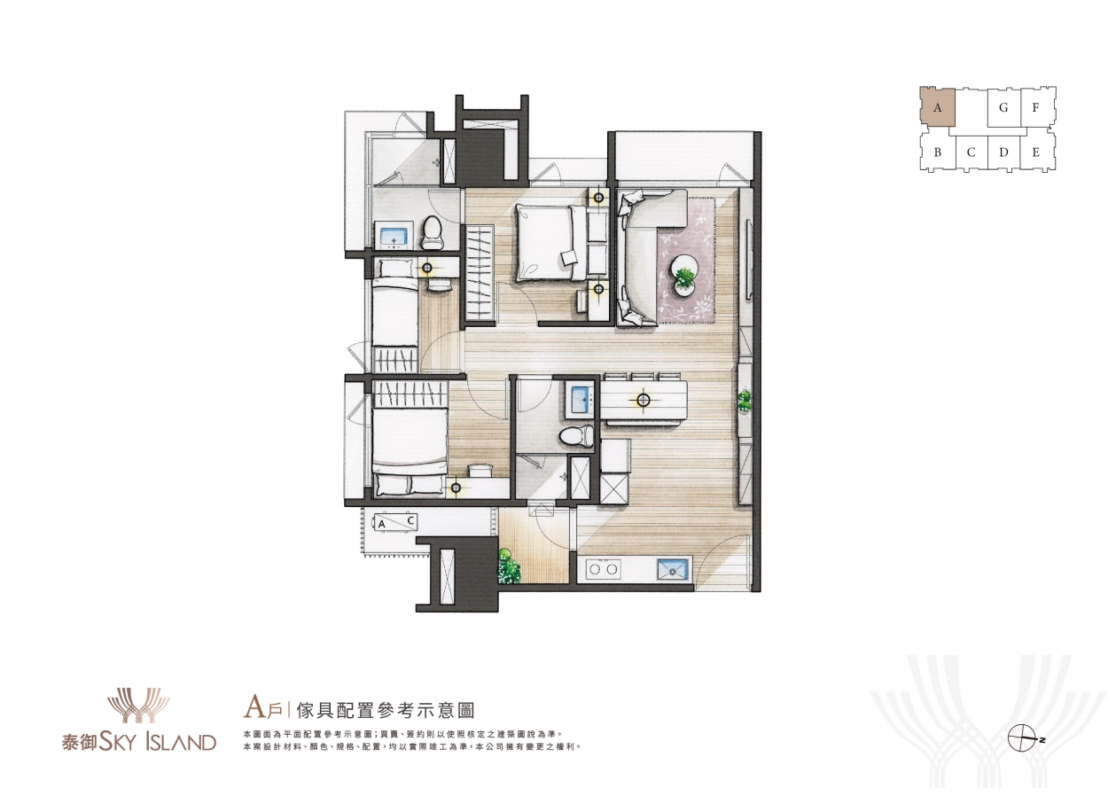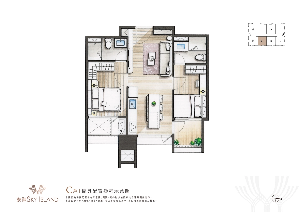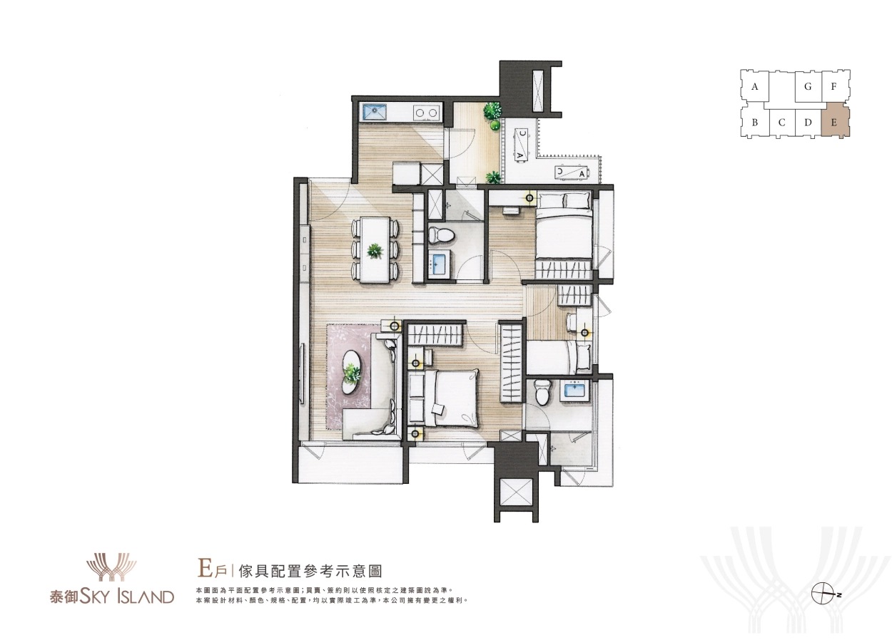 夢幻極具藝術設計的浮島建築外觀是一眼心動,而步入室內的設計裝潢當然也不能馬虎。泰御SKY ISLAND主打全室精裝入住,從天花板、地板、系統櫃、家具家電都精心規劃,更有不同風格設計可自由挑選,未來一卡皮箱就可直接輕鬆入住。(全室精裝詳細資訊可洽現場)